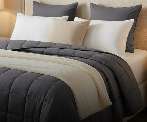 Edredão com textura interior borreguito extra fofa e com toque exterior suave e macio. Dê calor à sua noite de sono enquanto dá vida ao seu quarto.