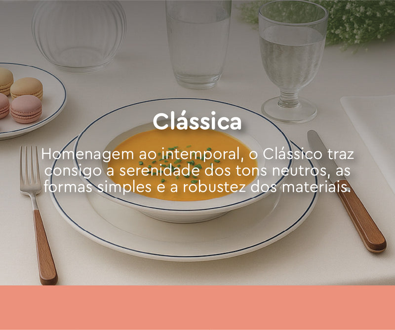 O design discreto destas linhas de pratos conta histórias que atravessam gerações e encaixa com harmonia em qualquer estilo de mesa. Com pratos atuais década após década, o Clássico é perfeito para mesas onde o essencial fala mais alto, a tradição se celebra em cada detalhe e o requinte não sai de moda.