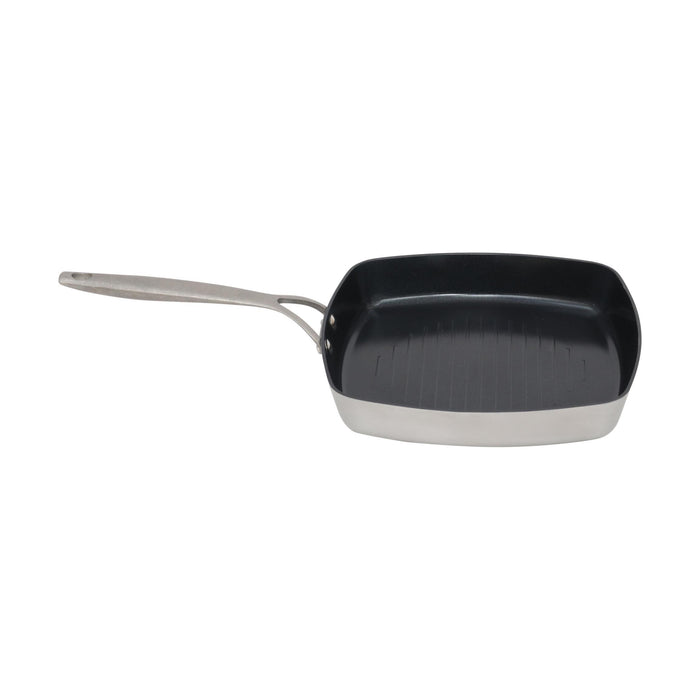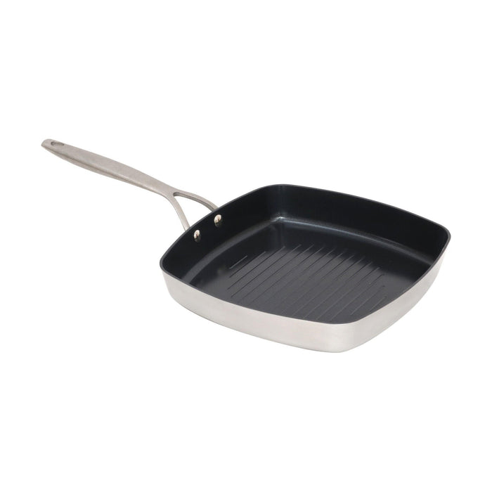 Grelhador quadrado de 26x26cm em alumínio 100% reciclado, com revestimento cerâmico preto sem PFAS e pegas fundidas em inox. Design moderno e sustentável com excelente desempenho térmico.