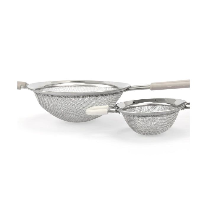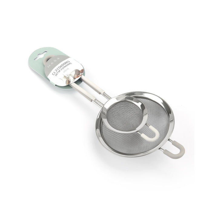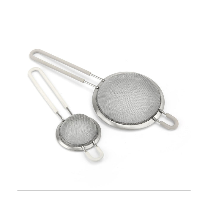 Conjunto com dois coadores de malha fina em tamanhos diferentes, ideais para coar líquidos, peneirar farinhas ou polvilhar açúcar e cacau. Cabos ergonómicos para manuseamento confortável e estrutura durável para uso diário.