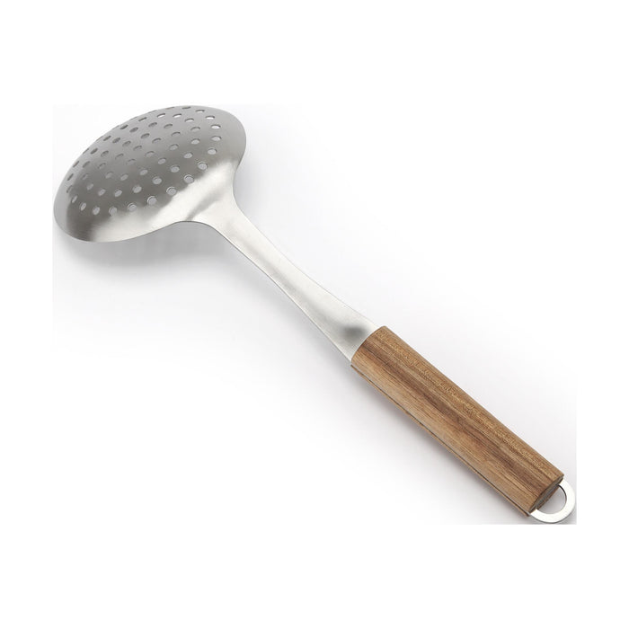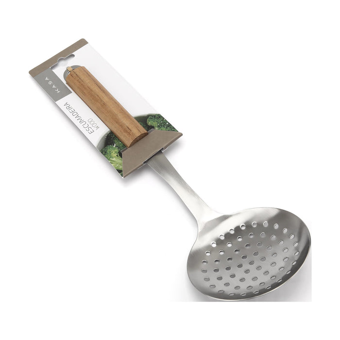 Escumadeira com cabo ergonómico em madeira e corpo em inox. Ideal para escorrer fritos, massas ou legumes cozidos, com durabilidade e elegância no manuseio.