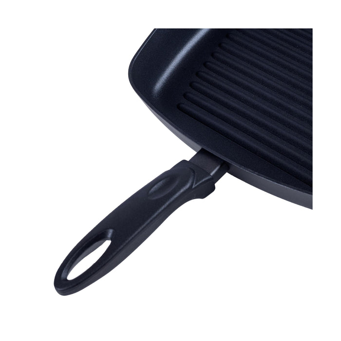 Grelhador de alumínio leve com 28x28cm, duplo revestimento antiaderente e cabo resistente em baquelite. Livre de chumbo, cádmio e PFOA. Compatível com gás, elétrico, vitrocerâmica e indução.