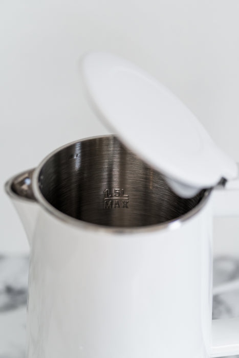 Jarro elétrico em branco com 2200W de potência e 1,5L de capacidade. Ferva água rapidamente, com facilidade e praticidade.